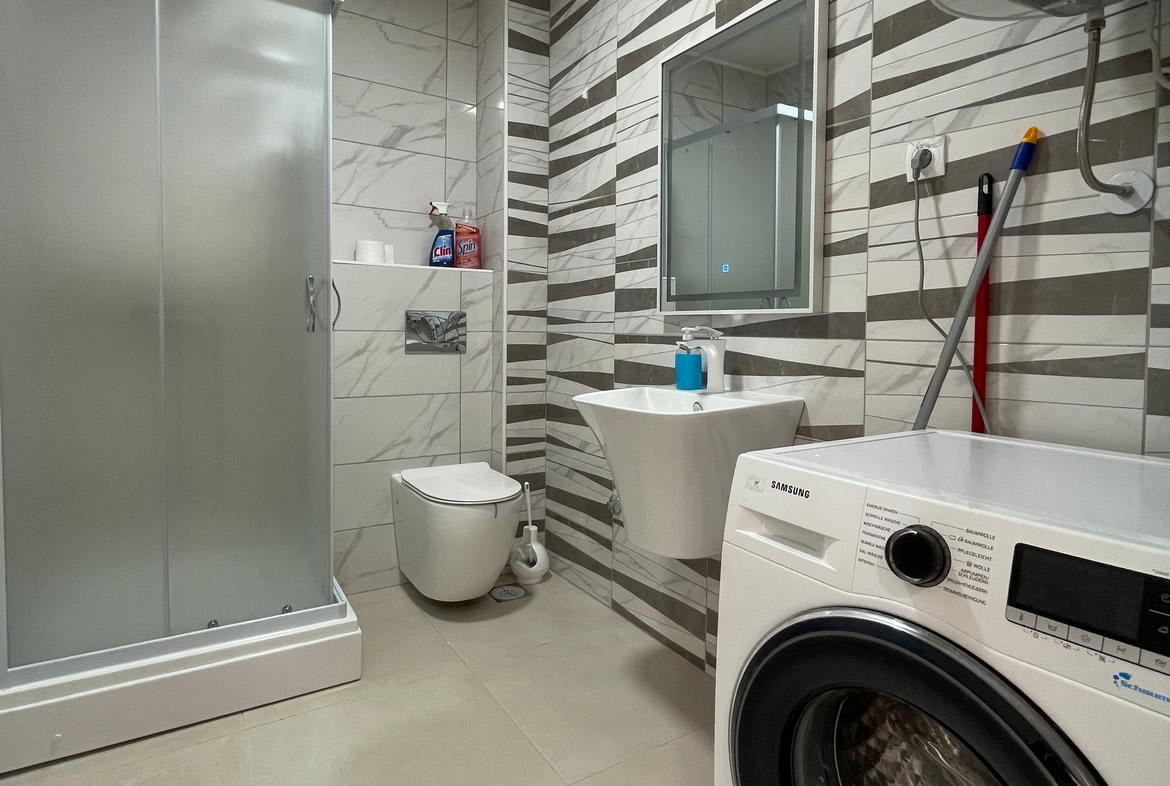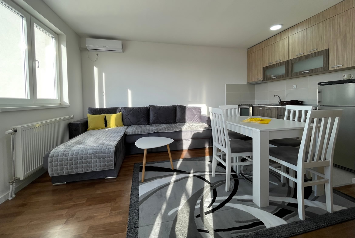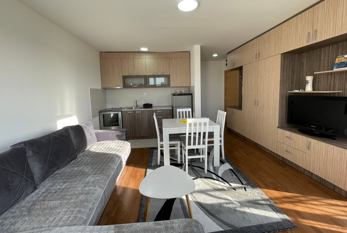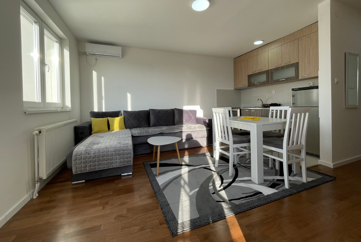 • Opremljenost: Namešteno – TV, klima, veš mašina, kuhinjski elementi, frižider, rerna, šporet, ležaj, plakar