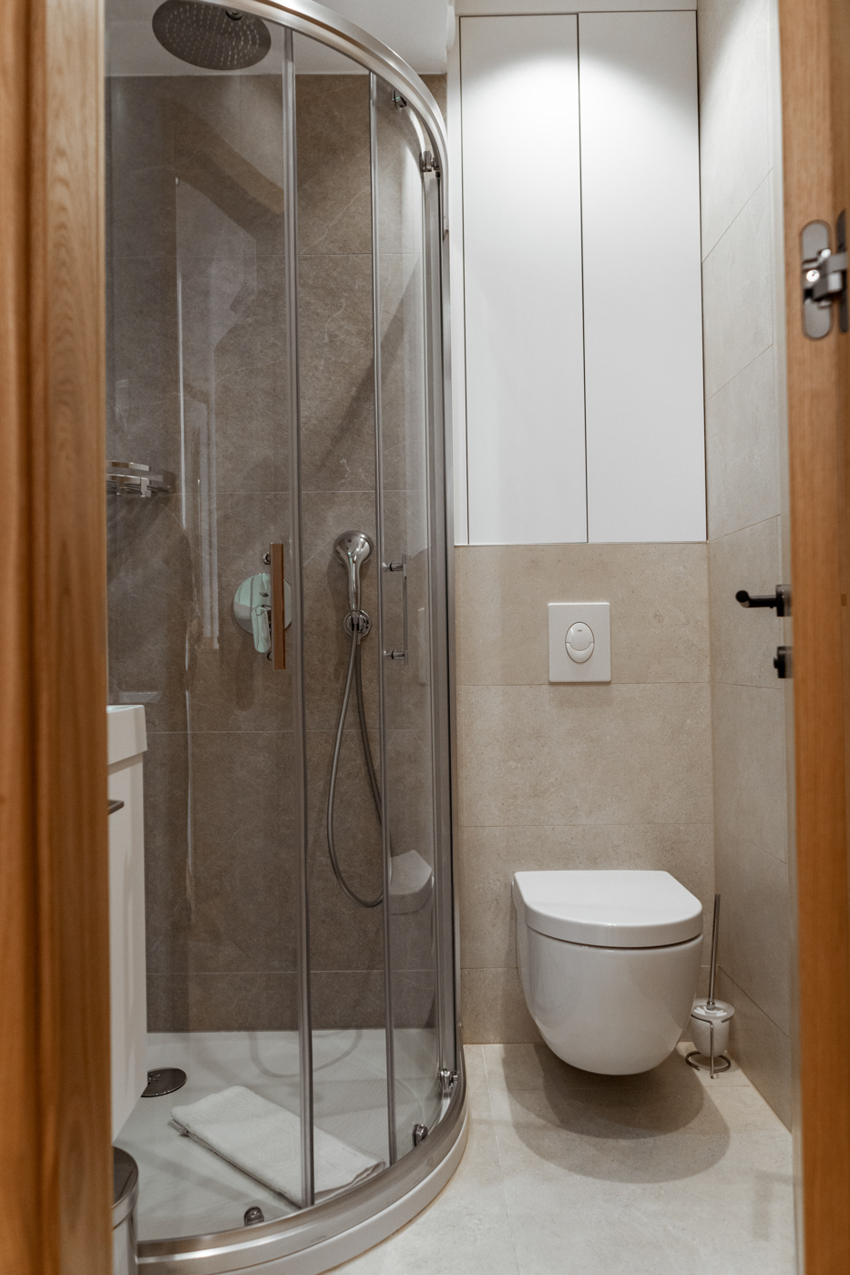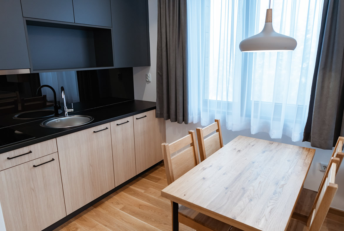 Apartmani su komforni i moderno opremljeni. Sastoje se od prostrane dnevne sobe, spavaće sobe, potpuno opremljene kuhinje i kupatila. Do apartmana se dolazi liftom ili stepenicama.